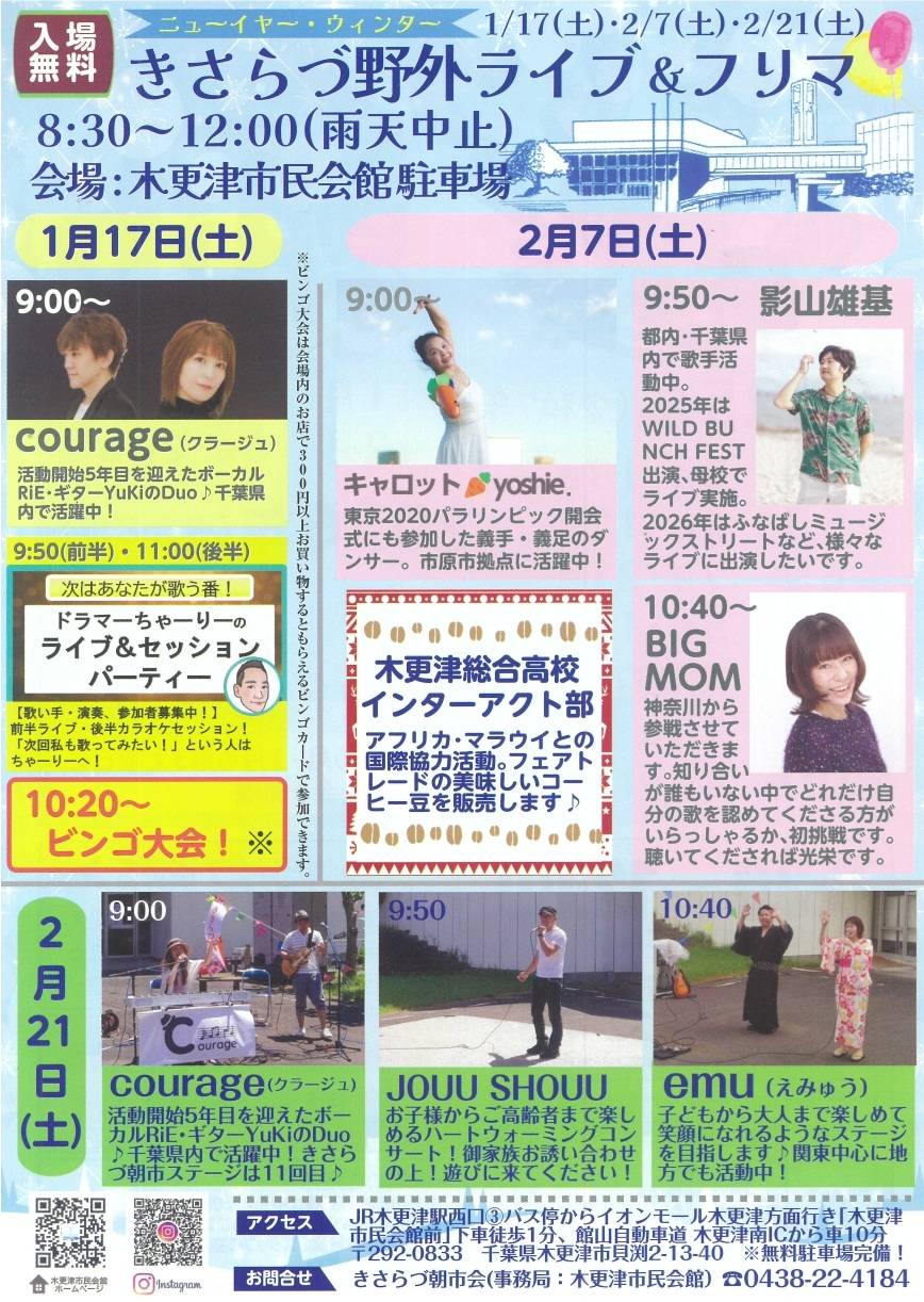 次回の「元気印 きさらづ朝市」は1月17日(土)開催。音楽ライブあり、出店者絶賛募集中!